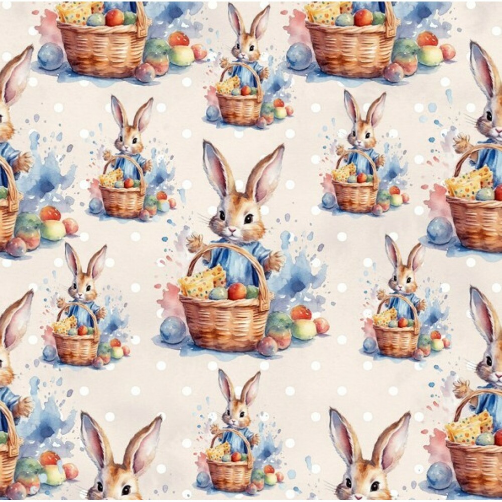 DZ25 - TRICOL. COLEÇÃO JUARI SOUZA - COLEÇÃO PASCOA 2026 - COELHOS COM CESTAS - 100% ALGODÃO - A0784-001